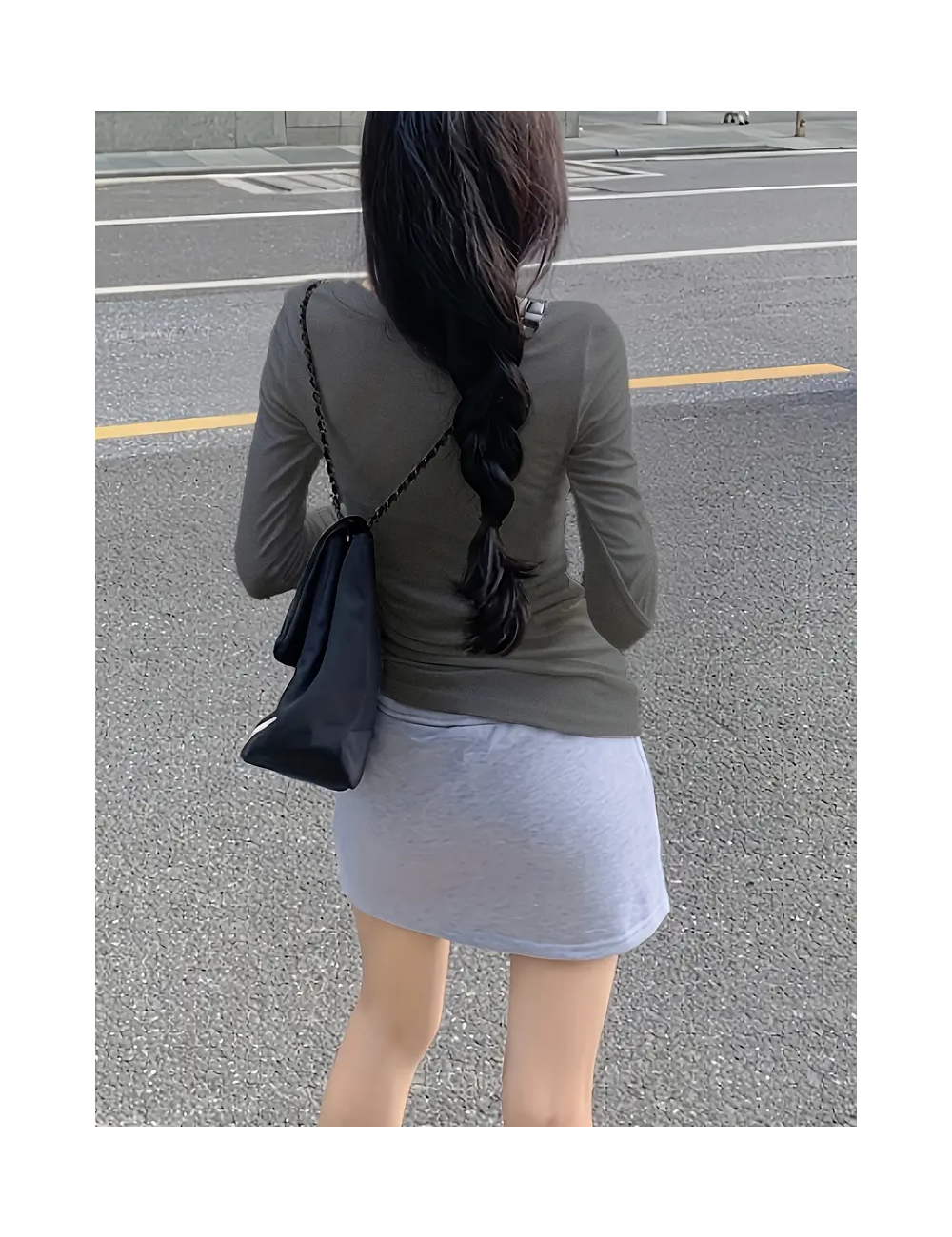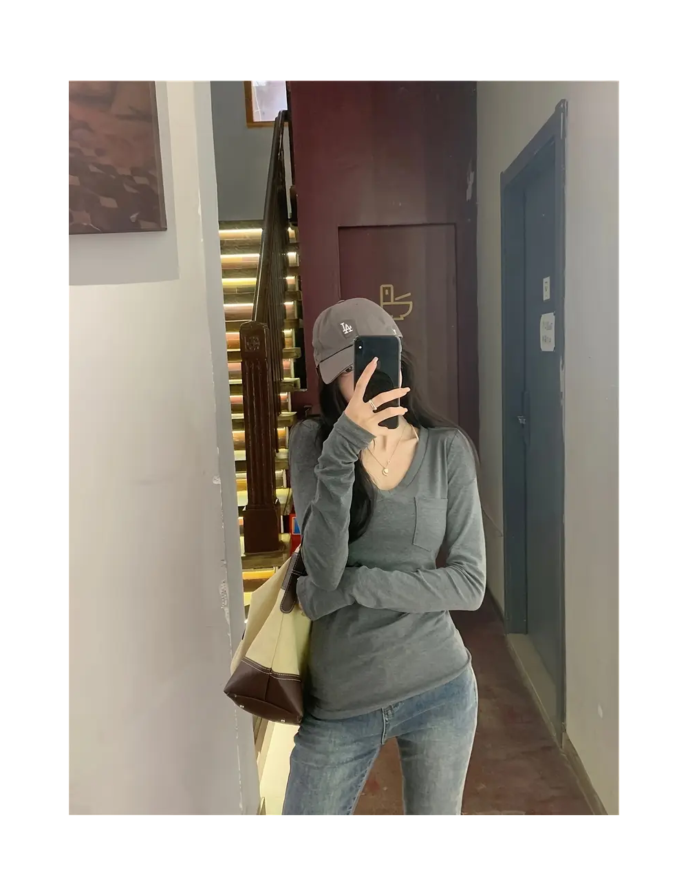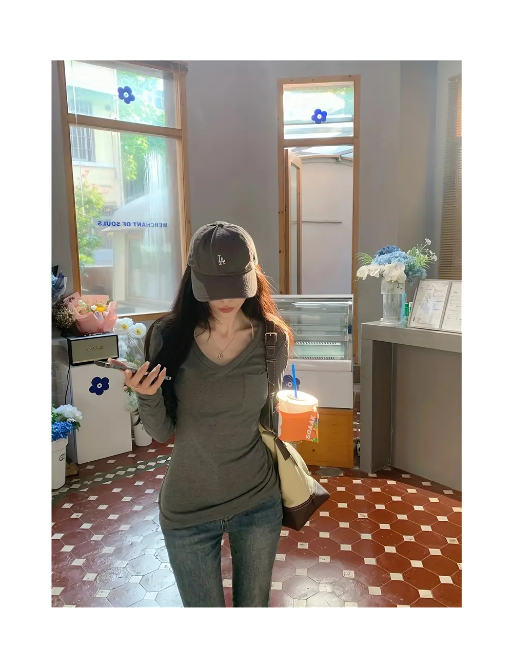 • 여성용 가을 겨울 롱 슬리브 V넥 티셔츠 - 사이드 포켓 스트레치 캐주얼 시크 탑, 기계 세탁 가능 레귤러 핏 솔리드 컬러 블라우스, 여성 티셔츠, 가을 패션, 스타일리시한 룩, 쉬운 관리 원단